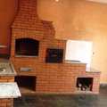fogão e forno a lenha, churrasqueira e pia, teto que liga cozinha a edícula